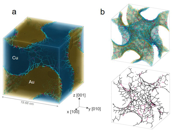 图2 仿调幅分解结构Cu/Au合金的分子动力学模拟。a)典型 Gyroid双相结构及其光滑连续半共格界面,以及b)界面上大量失配位错组成的三维位错网络。