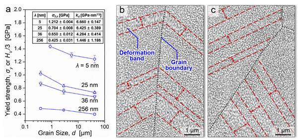 图4 仿调幅分解结构Cu/Au合金屈服强度的晶粒尺寸效应。a)虽然该材料晶粒尺寸(d)比结构尺寸(