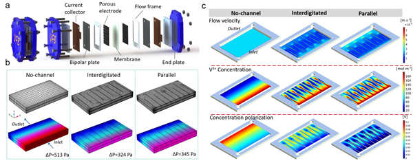 图1.(a)电池结构示意图;(b)电池压降仿真;(c)流速、反应物浓度及浓差极化分布仿真