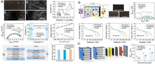 图2.(a)电极物理及电化学测试;(b)全钒液流电池实验;(c)电堆动态模拟