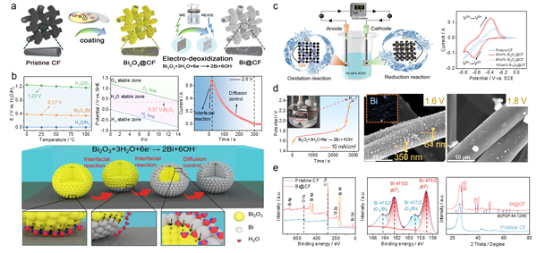 传质特性的优化在提升全钒液流电池高功率运行方面展示了显著效果,但全钒液流电池负极侧V2+/V3+迟缓的电化学动力学特性,仍然一定程度制约了全钒液流电池高功率运行下的转换效率。针对这一问题,研究人员在课题组前期杂原子掺杂调控电极的研究基础上(Energy Storage Materials,2021,34,301; Journal of Materials Chemistry A, 2021,9,17300),提出了工程化易操作的基于固-固转化的电脱氧工艺方法,在碱性条件下通过还原涂覆在电极纤维界面Bi2O3粉末,制备了具有高氧化还原可逆性的Bi负载电极(图3),显著提升了负极V2+/V3+电化学动力学特性,理论计算进一步揭示了V-3d和Bi-6p轨道杂化作用对电荷转移过程的促进作用,以此为基础组装的全电池实现了350 mA cm-2电密下450个循环73.6%的稳定能量转换效率输出(图4),400 mA cm-2高电密下运行转换效率有效提升近10%,为高功率电堆开发提供了技术支撑,相关研究结果以“Boosting anode kinetics in vanadium flow batteries with catalytic bismuth nanoparticle decorated carbon felt via electro-deoxidization processing”为题发表于Journal of Materials Chemistry A,2023,DOI:10.1039/D2TA09909H。
