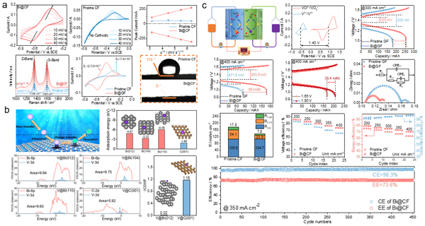 图4.(a)电极物理及电化学表征;(b)界面电化学理论计算;(c)全钒液流电池实验