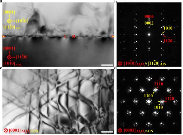 图1. AlN/Al2O3 (0001)非共格界面的显微结构。(a, b) 截面样品的透射电镜明场像和选区电子衍射图。AlN薄膜在Al2O3衬底上外延生长,界面上形成了明暗不均的衬度,表明界面上存在应力集中。(c, d) 平面样品的透射电镜明场像和选区电子衍射图。界面上形成了界面失配位错网络。标尺为200 nm。