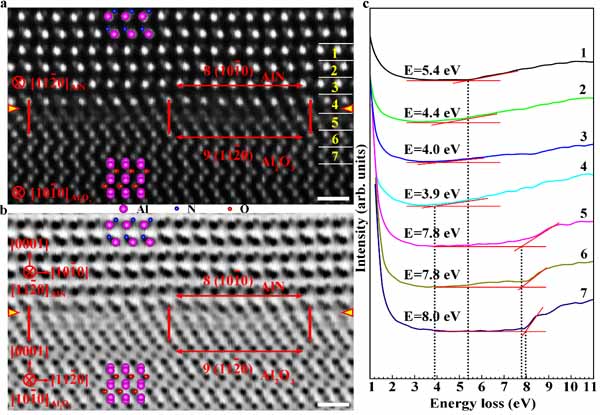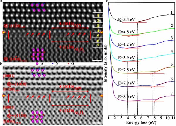 图3. AlN/Al2O3界面层错区的原子与电子结构。(a, b) 扫描透射电镜HAADF像和ABF像。界面层错形成于Al2O3一侧,但层错没有改变界面两侧材料的晶格匹配,界面上仍然是8个AlN的原子面匹配9个Al2O3的原子面。(c) 原子层分辨的价电子能量损失谱。界面的带隙降低为~ 3.9 eV,显著小于AlN和Al2O3体材料的带隙。标尺为5