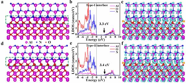 图4. AlN/Al2O3界面原子与电子结构的第一性原理计算。(a-c) 无层错区的原子模型、电子态密度和Al原子的差分电荷密度。(a-c) 层错区的原子模型、电子态密度和Al原子的差分电荷密度。无层错区和层错区的带隙分别为3.3 eV和3.4 eV,界面上键合强度高,形成了畸变的AlN3O四面体和AlN3O3八面体,存在Al-N键和Al-O键的竞争。