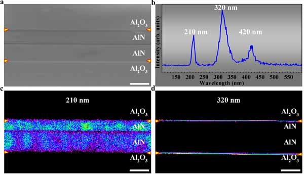 图5. AlN/Al2O3界面的阴极荧光测量。(a) 扫描电镜二次电子像,(b) 阴极荧光光谱,(c, d) 210 nm和320nm激光测得的阴极荧光分布图。210nm光激发来自AlN薄膜,320nm光激发来自界面。界面发光强度显著高于AlN薄膜的本征发光。标尺为2μm。
