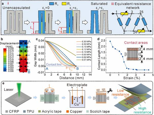 图1:柔性应变传感器的设计和制备. a 蛇形曲流结构的传感机制,b传感单元在表面切应力作用下的位移云图,c传感单元在不同表面切应力作用下相邻曲流条纹的间隙沿传感器宽度方向分布曲线,d 相邻曲流条纹的接触区域长度随应变的变化曲线,e 传感器制备流程示意图。
