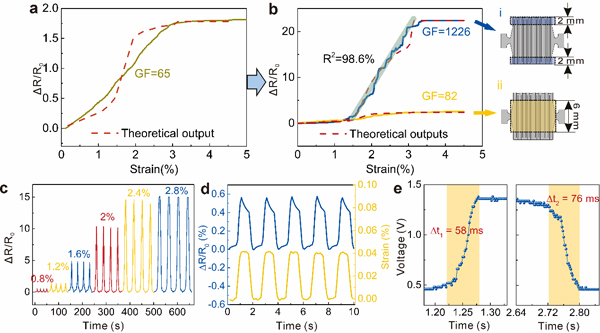 图2:柔性应变传感器的传感性能. a.高/低电阻区调控前的响应曲线,b.高/低电阻区调控后的响应曲线,c.在不同峰值应变下的循环响应曲线,极限检测应变,d.响应和回复时间。