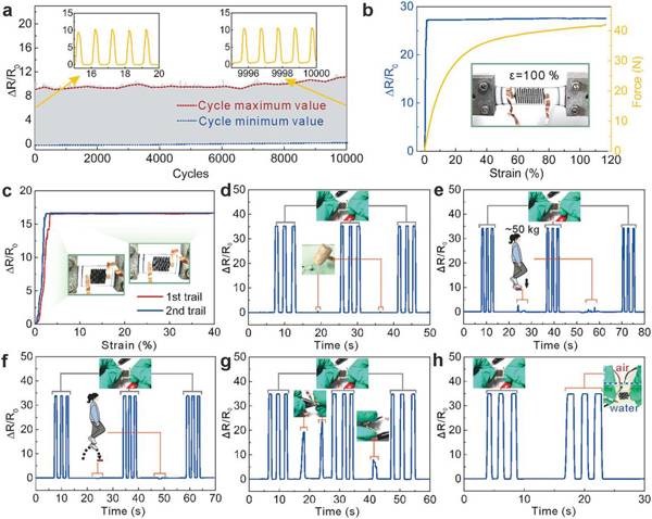 图3:柔性应变传感器的机械鲁棒性. a 循环稳定性,b 最大可承受应变,c-e 对严苛环境的耐受力。