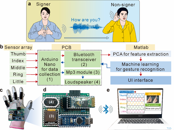 图4:可穿戴手语翻译系统. a 应用场景示意图,b 系统框架,c 手语手套,d 无线电路板,e 用户界面。