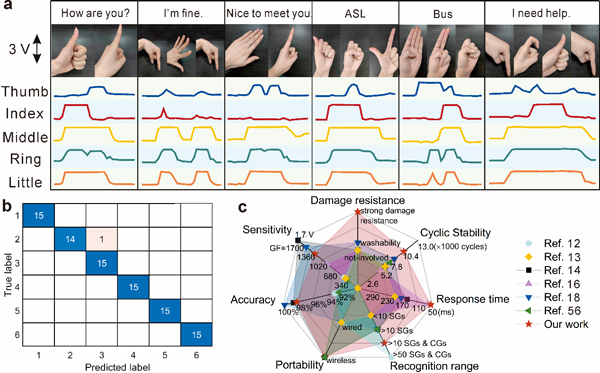 图5:手语识别验证. a 6种由复合手势组成的手语,b 手语翻译系统对6种手语的识别准确率,e 手语翻译系统的各项性能汇总。