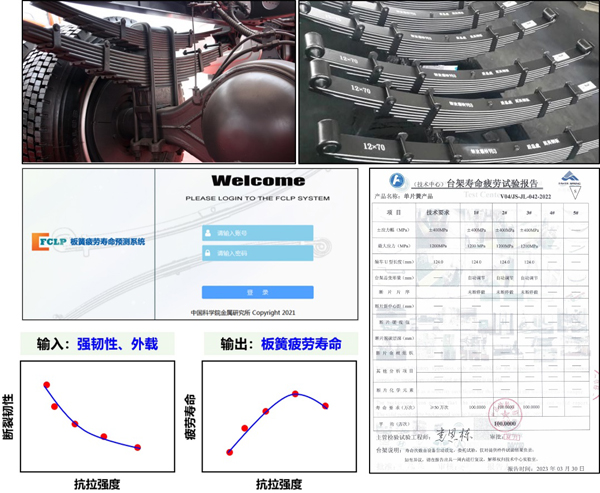 利用疲劳理论创新成果,该团队成员王斌副研究员、白鑫副研究员、朱艳坤助理研究员、张鹏研究员通过分析LQD1800板簧的强韧性能、理论模型参数、形状结构及受力状态,发展完善了适用于板簧的疲劳寿命预测与优化理论模型,并开发了板簧疲劳寿命预测与优化软件系统,为实现板簧疲劳延寿提供了有效工具。目前该疲劳预测软件系统已在富奥辽宁汽车弹簧有限公司安装运行,用于指导板簧抗疲劳设计与制造工艺优化。