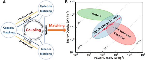 近日,中国科学院金属研究所沈阳材料科学国家研究中心先进炭材料研究部新型电化学能源材料与器件课题组,在前期电容器器件调控方法和电极匹配策略研究的基础上(Angew. Chem. Int. Ed., 2013, 52, 3722-3725; J Mater. Chem. A, 2021, 9, 3360-3368),提出了混合电荷存储器件电极的耦合与匹配理论,从电化学角度,系统性地分析了电极各性能匹配设计时所面临的耦合问题与解决策略,为混合电荷存储器件的设计与开发提供了新思路。