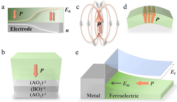 图1. 铁电畴的调控方式。(a)电极电荷屏蔽效应;(b)截止面的电荷失配效应;(c)缺陷偶极子与铁电极化的静电耦合效应;(d)挠曲电效应;(e)本工作提出的金属/铁电异质界面肖特基势垒效应。