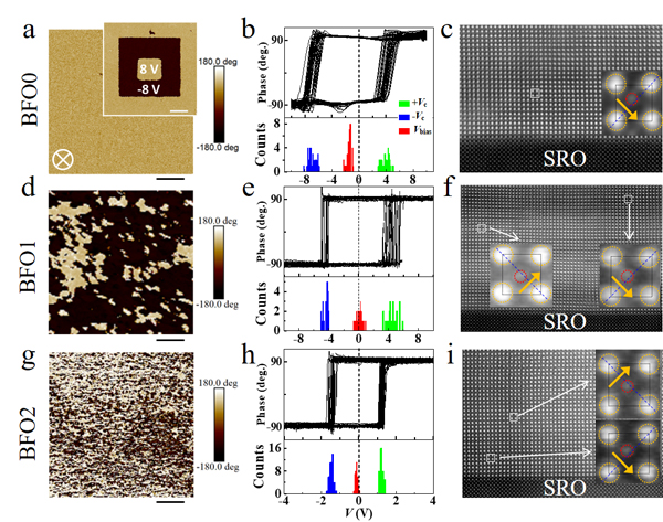 图2. SrRuO3/(Bi,Sm)FeO3薄膜的自极化铁电畴表征。(a),(d),(g)压电力显微镜的相位图;(b),(e),(h)单点压电回线及矫顽电压统计图;(c),(f),(i)SrRuO3/(Bi,Sm)FeO3界面的高角度环形暗场像。