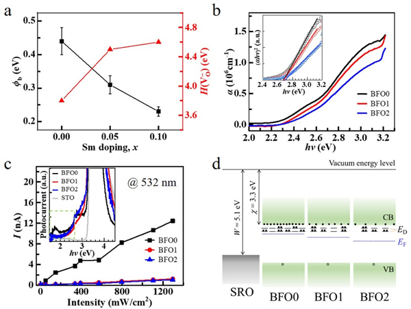 图3. SrRuO3/(Bi,Sm)FeO3界面肖特基势垒。(a)Sm掺杂调控界面势垒(左轴)及BiFeO3中氧空位形成能(右轴);(b)(Bi,Sm)FeO3薄膜的吸光系数和光学带隙;(c)(Bi,Sm)FeO3薄膜的光电流;(d)Sm掺杂调控BiFeO3费米能级示意图。