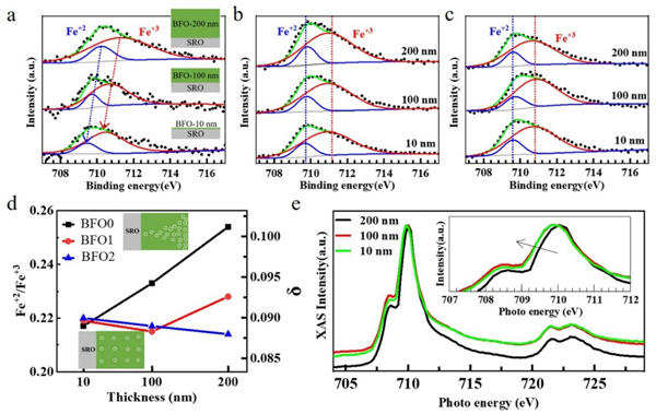 图4. 不同薄膜厚度下氧空位的浓度与分布。(a)BiFeO3,(b)Sm0.05Bi0.95FeO3和(c)Sm0.1Bi0.9FeO3的X射线光电子能谱;(d)不同Sm掺杂BiFeO3薄膜的Fe2+/Fe3+浓度比值(左轴)及氧空位浓度BiFeO3-δ值(右轴);(e)BiFeO3的X射线吸收谱。