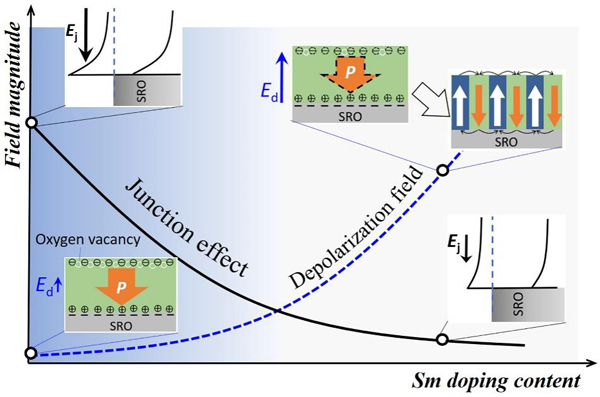 图5. (Bi,Sm)FeO3薄膜铁电自极化的调控机制。界面肖特基势垒和退极化场的相互竞争导致铁电多畴的形成。两者均与氧空位浓度及其分布密切相关。