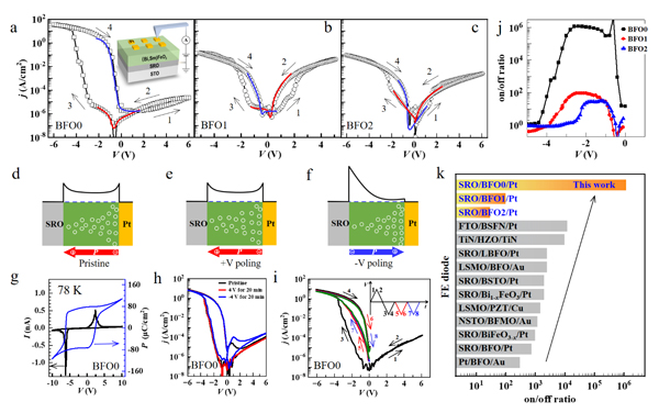 图6. SrRuO3/(Bi,Sm)FeO3/Pt忆阻器的阻变翻转行为。(a-c)I-V曲线;(d-f)BiFeO3二极管在初始态、极化向下态,极化向上态的能带结构示意图;(g)BiFeO3二极管在78 K下的I-V回线(左轴)及相应的P-V回线(右轴);(h)电极化对BiFeO3二极管I-V阻变行为的影响;(i)不同电压扫描过程对I-V阻变行为的影响;(j)SrRuO3/(Bi,Sm)FeO3/Pt器件的开关比;(k)各类铁电二极管的开关比。