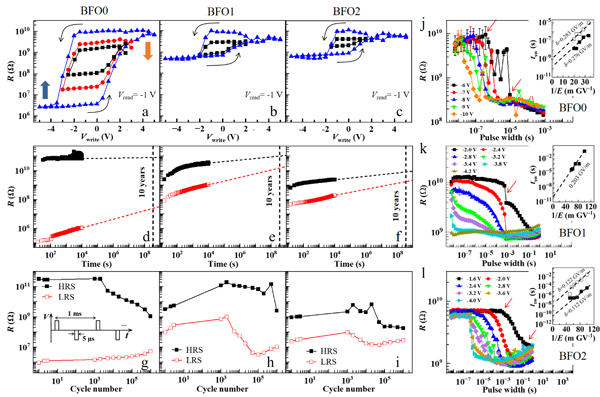 图7. SrRuO3/(Bi,Sm)FeO3/Pt忆阻器的器件性能。(a-c)阻变记忆回线;(d-f)电阻保持性能;(g-i)电阻疲劳性能;(j-l)阻变翻转动力学。