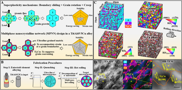图1. 多相纳米网状超塑性钛合金的组织设计、制备与表征。(A)组织设计思路。(B)材料制备流程。(C)初始态组织的EBSD表征结果。(D)初始态组织的高分辨TEM观察。