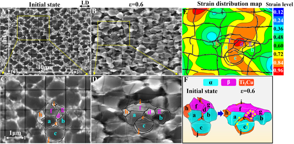 图2. 原位SEM观察高温拉伸过程中材料的超塑性变形机制。(A-D)SEM组织演变。(E)应变分布图。(F)晶粒滑移与倾转机制的示意图。