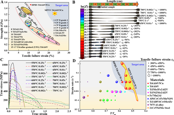 图3. 多相纳米网状Ti6Al4V5Cu合金的力学性能。(A)室温拉伸性能。(B)高温拉伸性能。(C)高温拉伸应力-应变曲线。(D)不同材料的超塑性变形能力对比图。