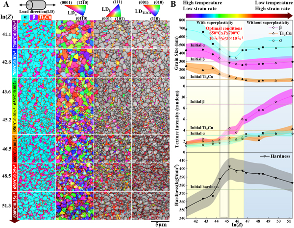 图4. 多相纳米网状Ti6Al4V5Cu合金超塑性变形后的组织。(A)变形后的EBSD分析。(B)变形后的晶粒尺寸、织构强度、维氏硬度随lnZ参数的变化。