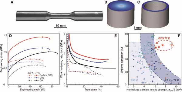 图1 梯度位错结构(GDS)合金及其典型低温力学行为。 (A)狗骨头棒状宏观拉伸样品;(B) 样品截面示意图,显示自表(深蓝色)及芯(浅灰色)梯度结构分布;(C) 梯度位错管状样品标距段三维X-射线重构形貌(管壁厚度~0.45 mm );(D) GDS, 管状GDS和粗晶的拉伸工程应力-应变曲线和 (E) 真应力-应变曲线; (F) 均匀塑性与归一化抗拉强度曲线, 表明梯度位错结构合金的优异低温综合力学性能。