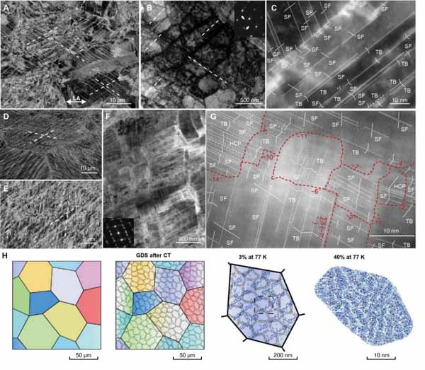 图2 梯度位错结构表层77 K拉伸结构演变特征。拉伸应变3%时截面SEM (A) 和TEM (B) 结果,晶粒内不同滑移面上相互交割的层错束穿过多个位错胞;(C) 对应的HAADF-STEM结果表明层错束包含超高密度的层错和孪晶结构。拉伸应变40%时截面SEM (D-E) 和TEM (F) 结果,晶粒内已产生高密度细化结构-纳米层错畴;(G) 对应的HAADF-STEM结果表明位错胞被极小层错畴进一步细化;(H) 77 K拉伸变形过程中由原始位错胞逐渐转变为高密度亚十纳米层错畴的动态结构细化示意图。