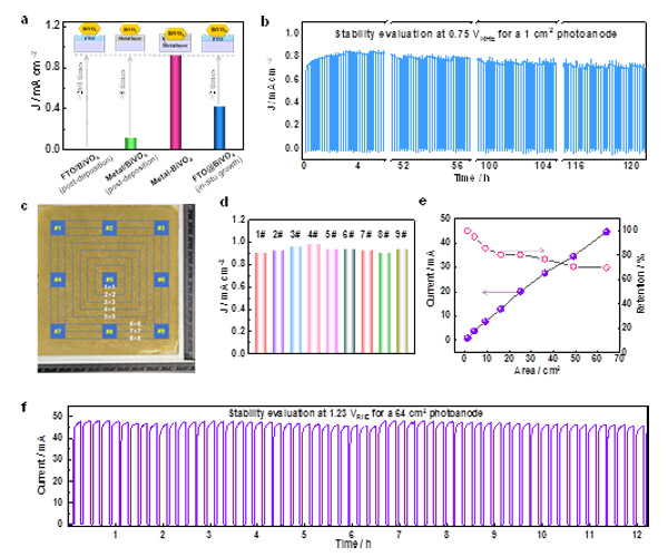研究人员利用熔融的低温液态金属作为导电集流体和粘结剂在选定基体上规模化成膜,利用辊压技术进行半导体颗粒的嵌入集成,实现了半导体颗粒的规模化植入(图1)。半导体颗粒镶嵌在液态金属导电集流体薄膜中形成了三维立体的强接触界面,所制备的半导体颗粒嵌入式人工光合成膜具有优异的结构稳定性,其光生电荷收集能力也得到大幅提升(图2)。以BiVO4(钒酸铋)为例,嵌入式BiVO4光电极的活性相比非嵌入式BiVO4光电极高出2倍,且长时连续工作120h几乎无活性衰减。光电极从1 cm2放大至64 cm2后,面积归一化光电流密度仍可保持约70%(图3),远优于目前报道的非嵌入式大面积BiVO4光电极的活性保持率(<30%)。进一步在液态金属膜中同时嵌入BiVO4颗粒和Rh掺杂SrTiO3(Rh:SrTiO3)颗粒分别作为产氧和产氢光催化材料,首次构建出嵌入式全固态Z型光催化材料薄膜面板,在可见光(>420 nm)照射下实现了满足化学计量比的全分解水产氢和产氧,其活性是传统非嵌入式金膜支撑光催化材料薄膜面板的2.9倍,超过上百小时持续运行无衰减(图4)。