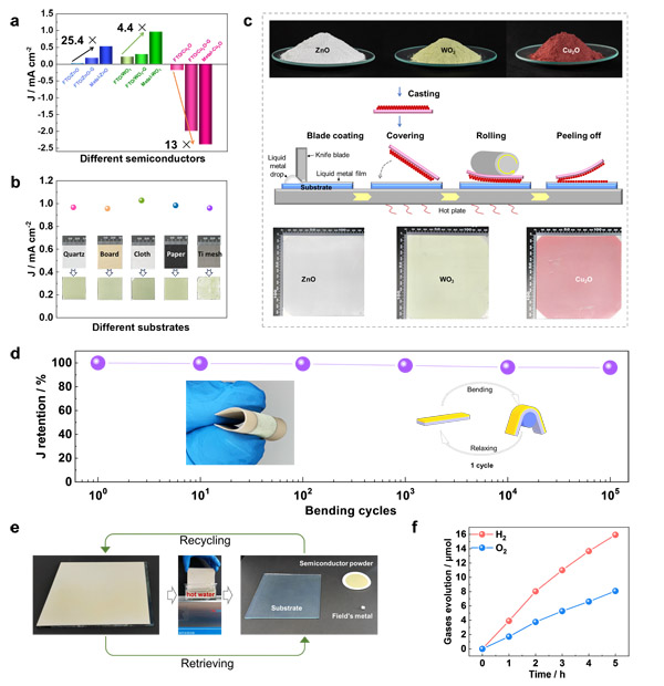 该液态金属镶嵌半导体颗粒的新型仿生人工光合成膜制备技术具有普适性好、膜结构稳定性高、易于规模化和原材料易回收等优势。利用商业化半导体颗粒(如ZnO、WO3和Cu2O等)结合通用辊压技术,可实现不同半导体光活性薄膜在各种基体上的规模化制备,所获得的颗粒嵌入式薄膜的活性均显著优于传统方法获得的对照样品。在柔性基体上集成的薄膜在大曲率弯折10万次以上仍可保持95%以上的初始活性。此外,利用简单的热水超声处理,即可将半导体颗粒、低温液态金属以及基体进行分离回收再利用,且回收再集成制得的光活性薄膜表现出与原始薄膜近乎相同的活性(图5)。