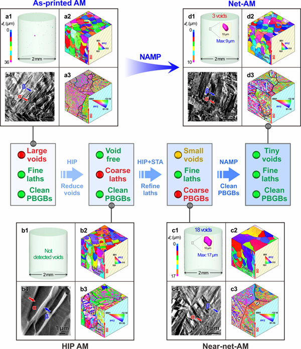图1. 打印态、NAMP态以及其他两种典型状态3D打印钛合金组织和缺陷特征:(a)打印态;(b)热等静压(HIP)态;(c)Near-net-AM态;(d)Net-AM态。