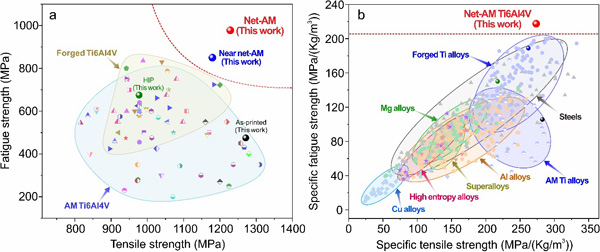 大量疲劳实验表明这一近Net-AM钛合金有效避免了从打印气孔、粗大板条及α相富集晶界等多种疲劳短板处开裂(图2),充分展示出3D打印组织自身所特有的高疲劳抗性:其拉-拉疲劳强度从原始态的475 MPa提升至 978 MPa,增幅高达106%(图3)。通过对比发现,这种近Net-AM组织Ti-6Al-4V合金不仅在所有钛合金材料中具有最高的拉-拉疲劳强度,而且在目前已报道的材料疲劳数据中,还具有最高的比疲劳强度(疲劳强度除以密度)。