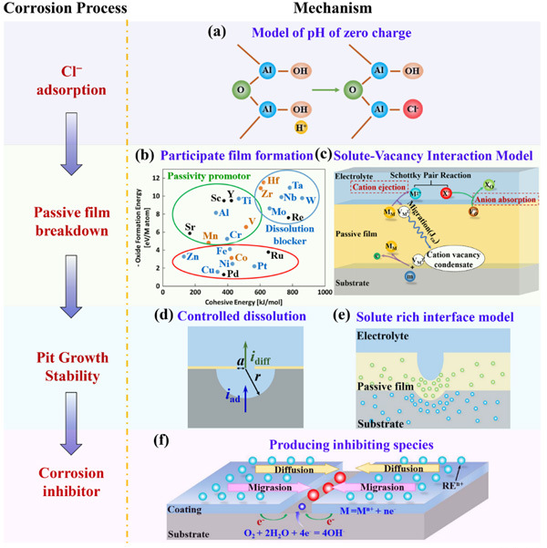 图1.基于点蚀过程不同阶段,合金元素对铝基非晶合金耐蚀性影响的不同机制