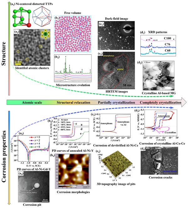 传统铝合金具有轻质、高强、低成本等优点,已被广泛应用航空航天等领域。然而,第二相的存在使该类合金在腐蚀环境下极易发生局部腐蚀。铝基非晶合金结构与组元成分均匀,兼具高强度和优异的耐蚀性能。此外,作为一种模型体系,有利于从多尺度揭示合金元素与合金腐蚀的内在关联性,推动更高综合性能铝合金的研发。