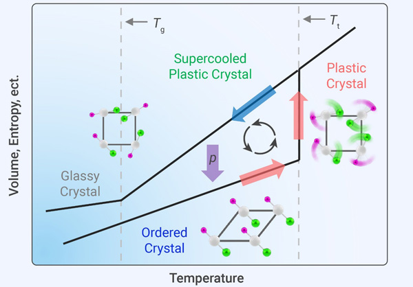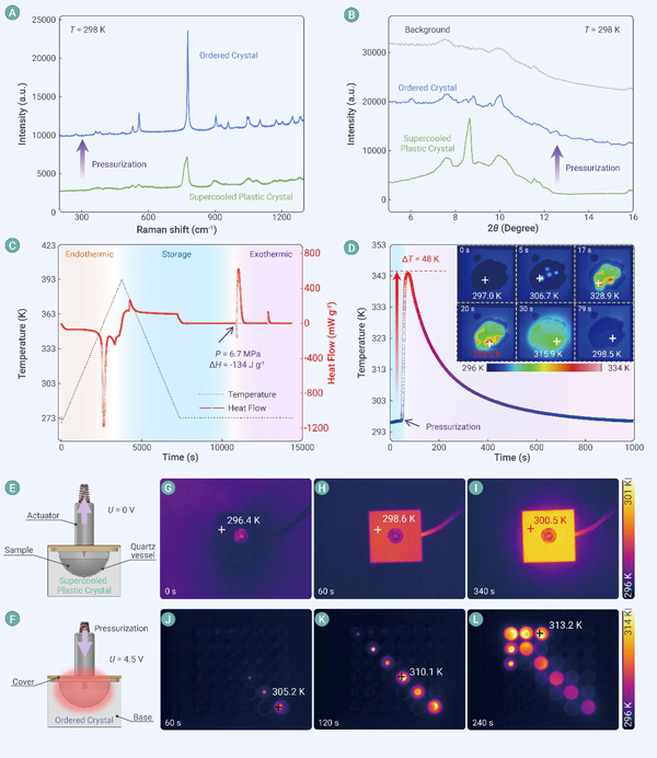 塑晶又称取向无序晶体,其中组成分子或原子基团的质心构成长程有序晶格,但取向却如同液体一般呈现动态无序。随着温度逐渐降低,塑晶相的取向也有序化,称为有序晶体。如若快速降温抑制有序相变,塑晶则处于过冷态,取向逐步冻结,最终演化为玻璃态,即玻璃晶体态。玻璃晶体态较为特殊,作为单相材料却兼具玻璃和晶体特征。上述几种特殊物相及相互转化关系请参考图2。该研究工作具体以塑晶材料2-氨基-2-甲基-1,3-丙二醇(AMP)为原型,结合中子散射和介电谱测量技术,系统研究了材料晶体结构、原子动力学和相变行为,证实了其过冷塑晶相和玻璃晶体相的存在。在室温下,过冷塑晶相对压力极为敏感,6.7 MPa压力即可诱导其向有序晶体相的转变,同时释放134 J g−1的潜热,在20 s内温度升高48 K。该团队设计开发了一种电驱动压力可控放热的概念装置,发现1 J电能即可诱导材料发生相变,释放之前所存储的383 J热能(图3)。