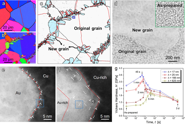 图1. 仿调幅分解结构Cu/Au合金在退火条件下的界面结构演化和强度变化。(a)制备态和(b)退火初期Cu/Au合金样品的EBSD图像。(c)图为(b)图的结构示意图。(d)退火初期新相形核生长前沿的SEM照片;(e)制备态和(f)退火态样品界面的HR-STEM照片;(g)不同结构尺寸Cu/Au合金的显微硬度随退火时间的变化。退火温度为450 ℃。