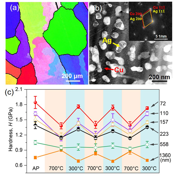 图2. 仿调幅分解结构Cu/Ag合金的微观组织及硬度的往复调节。制备态Cu/Ag合金的(a)EBSD和(b)STEM图像;(c)不同结构尺寸Cu/Ag合金硬度随退火温度的循环变化。