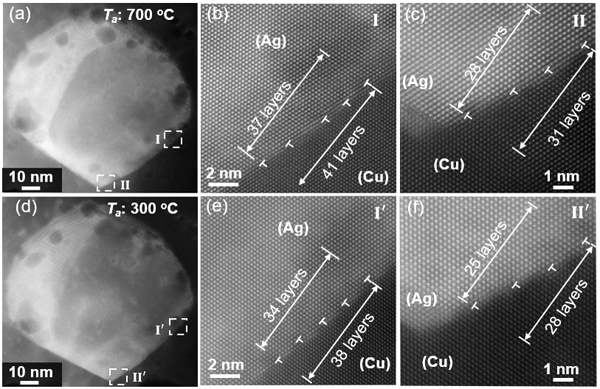 图3. 退火调节Cu/Ag界面的准原位观察。Cu/Ag合金在(a-c)700 ℃退火后和(d-e)300 ℃退火后界面的HR-STEM图像。