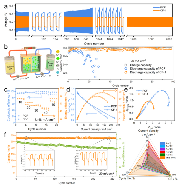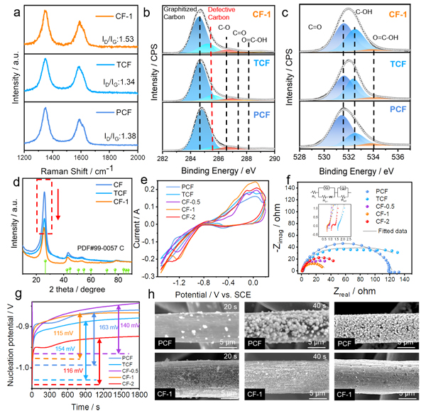 图2. (a-d)电极缺陷与成分表征;(e-g)电极电化学测试;(h)铁沉积形貌