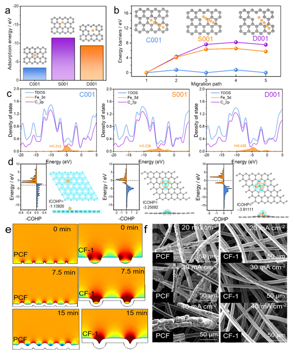 图3. (a-d)电极界面反应理论计算;(e)铁沉积反应有限元仿真;(f)沉积形貌