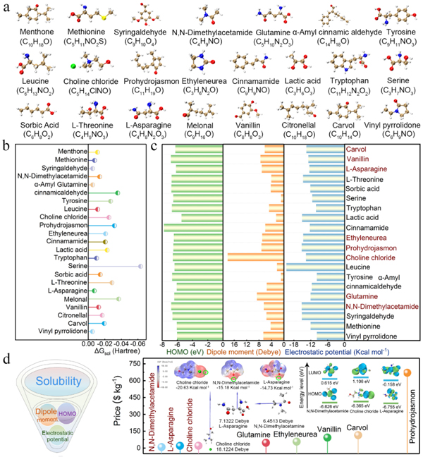 图5. (a-c) 23种极性溶剂的溶解自由能、HOMO轨道、偶极矩、静电势计算;(d)极性溶剂成本分析