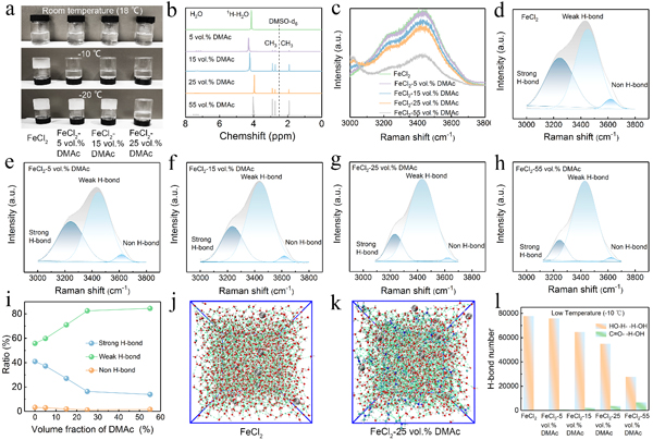 图6. (a)低温溶液状态;(b)NMR分析;(c-h) Raman分析;(i)溶液氢键组成分析;(j-l)氢键数量分子动力学计算