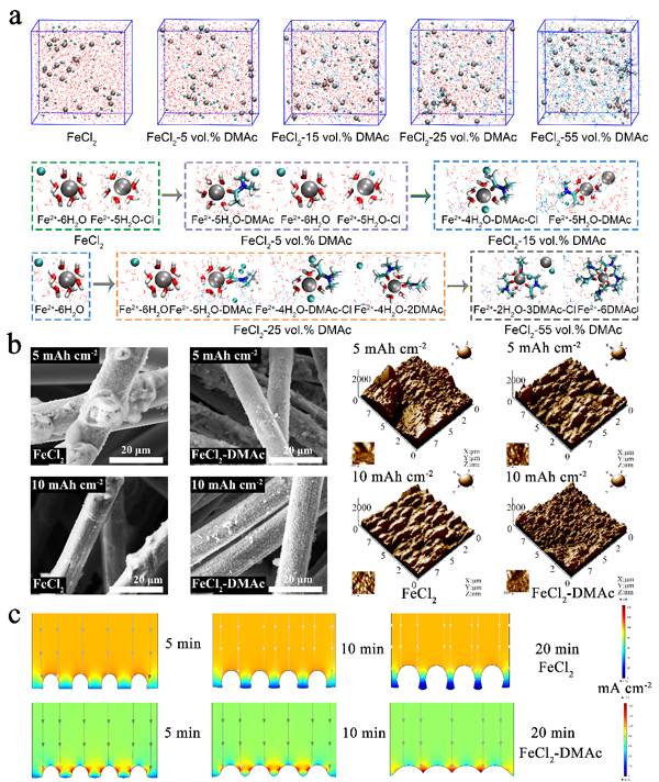 图7. (a)Fe2+溶剂化结构分子动力学计算;(b)铁沉积形貌分析;(c)铁沉积有限元仿真分析