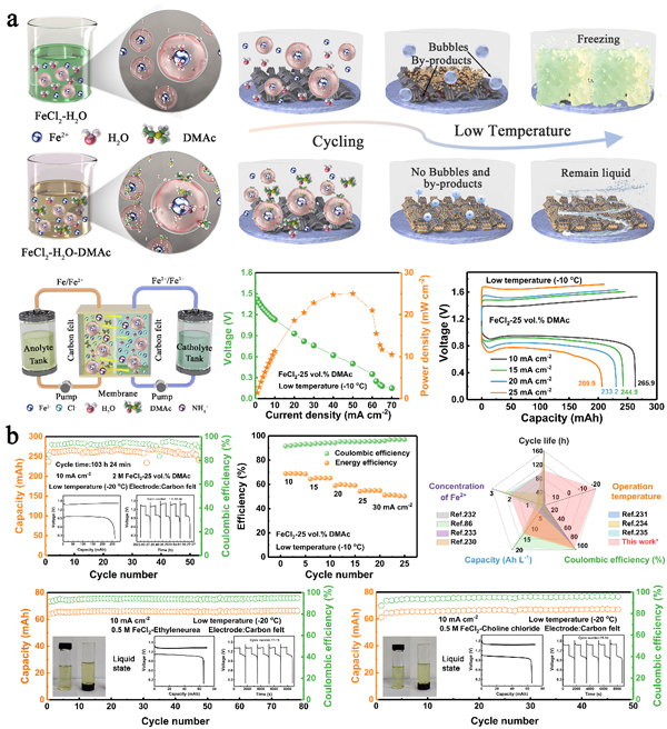 图8. (a)低温全铁液流电池功率密度与电压曲线;(b)低温电池循环与倍率性能