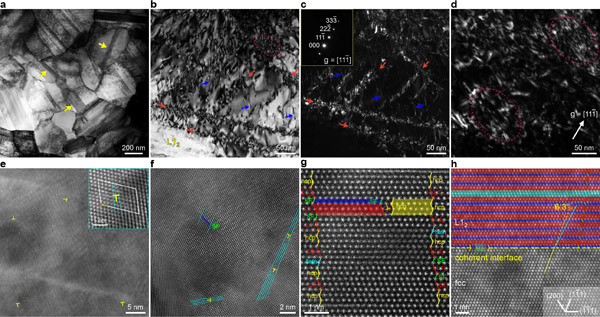 图1.利用像差校正高角环形暗场像和弱束暗场像分析了位错的核心结构、位错密度及位错与界面的交互作用。变形过程中吕德斯带前端位错快速产生和累积形成位错缠结,这些位错缠结会捕获可动位错,成为吕德斯带扩展的主要机制。