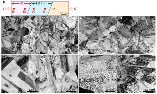 图2.利用透射电镜观察距吕德斯带前端不同距离的样品,可以看到距离吕德斯带前端越远,位错密度越高。
