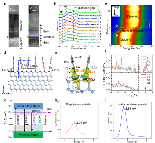 )面和石墨(0001)面以3:2 和 2:2的对应关系共价连接,与高温高压方法构筑的共价金刚石-石墨界面不同。电子能量损失谱阐明界面处石墨中电子密度增加,具有sp2/sp3碳混合杂化特征,表明金刚石和石墨在共价键界面上拥有强相互作用。第一性原理计算揭示强相互作用界面诱使电子从金刚石相向石墨相转移,进而调变了界面碳的电子性质,引发石墨在Fermi能级附近的态密度异常增加,并在金刚石的导带底引入局域能级,致使共价金刚石-石墨材料阴极发光特征峰比氢终端金刚石材料蓝移430 meV。这项研究工作深入理解了等离子体CVD构筑共价金刚石-石墨材料,并进一步拓展了对调制金刚石电子性质的认识,为开发先进金刚石电子器件提供基础参考。