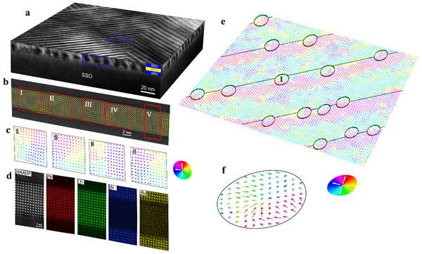 图2.SmScO3衬底上SrRuO3/PbTiO3/SrRuO3三层薄膜的截面样(b-d)和平面样(e,f)的像差校正透射电镜图像,展示了极化布洛赫点的原子尺度极化构型。